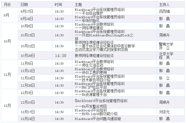 公司已于2013年引入Blackboard信息化教学平台,引导各教学单位和广大教师开展基于Blackboard教学平台的信息化课程建设及教学方式改革。为了更好地帮助各位老师更快地学习和熟练Blackboard教学平台的基本操作、在线课程建设及教学活动的开展,现将系统开发商2014-2015学年第一学期在线培训计划公布如下,请各教学单位及广大教师积极自主参加各项在线培训。