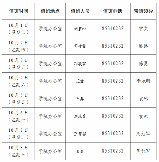 注意事项:1、按时上下班,电话及时接听;2、每日清洁办公场所;3、注意安全和防火,每天定时巡查公司办公场所;4、做好假期信件报纸的收发工作,每周一、周四取信件报纸;5、每周三、周五给办公室、学工组等所有绿植浇水各一次;6、值班结束时须做好值班期间工作登记;7、遇紧急突发情况,及时向相关领导汇报。