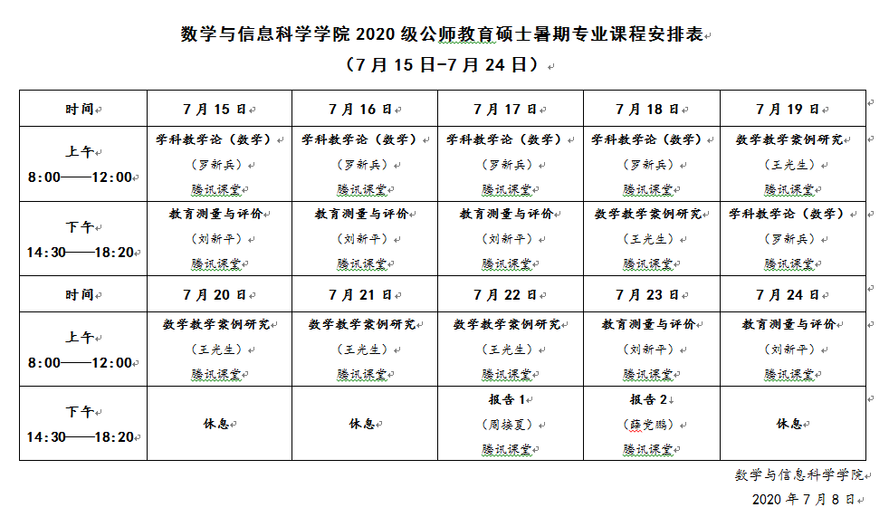 数学与信息科学公司2020级公师教育硕士暑期专业课程安排表