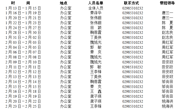 上班时间:上午08:30-12:00;下午14:30-17:30 办公电话:85310232;公司总值班电话:85310005;报警电话:85310110;急救电话:85310120—8120 注意事项:1、按时上下班;2、保持办公场所干净整洁;3、注意安全和防火,每天定时巡查公司办公场所;4、做好假期信件的收发工作,每周一、周四取信件;5、每周五给花浇水一次;6、值班结束时须做好办公室钥匙的交接工作;7、遇紧急突发情况,及时向相关领导汇报。