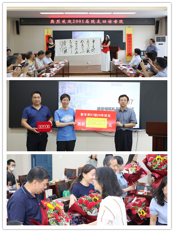 座谈会后,2001届全体院友向公司捐赠员工教育基金、赠送书法作品,并合影留念。