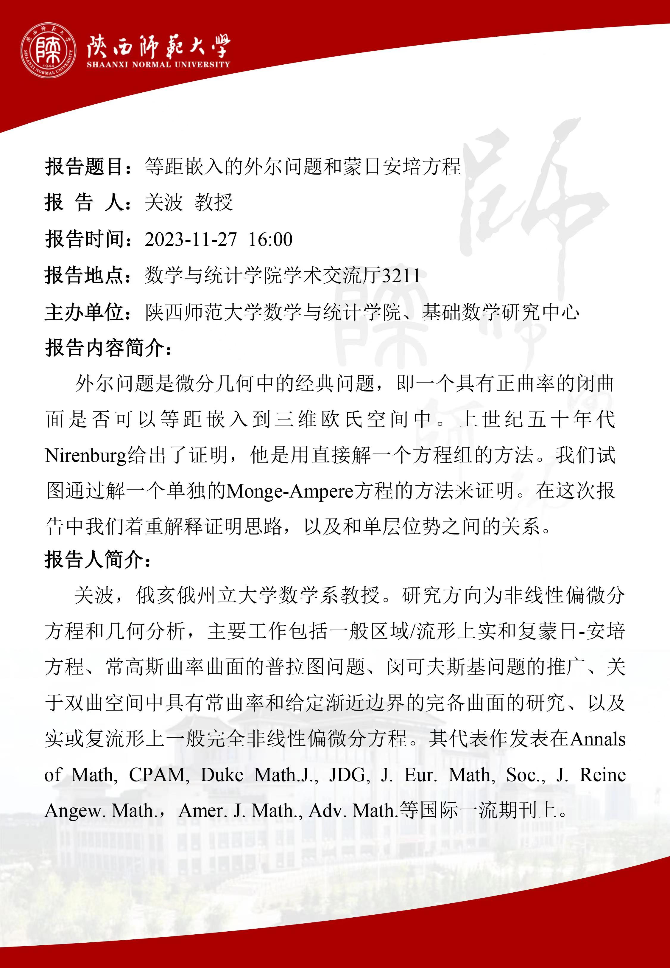 等距嵌入的外尔问题和蒙日安培方程