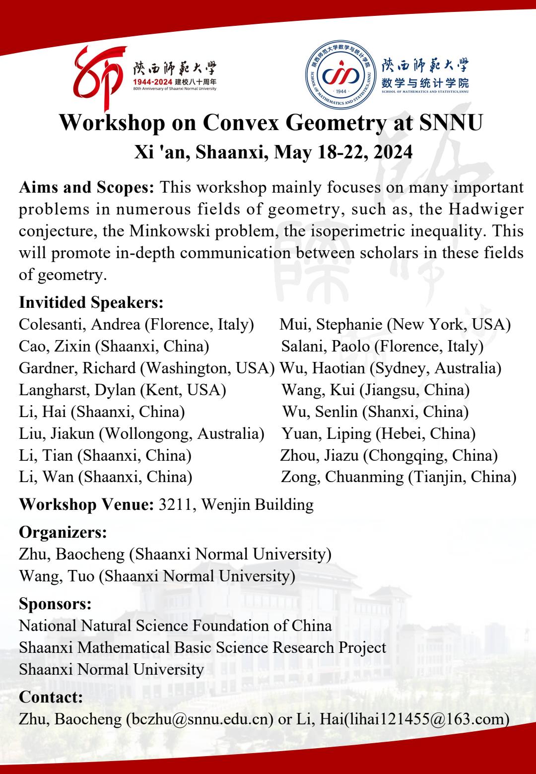 八秩同辉校庆系列37 会议:Workshop on Convex Geometry at SNNU
