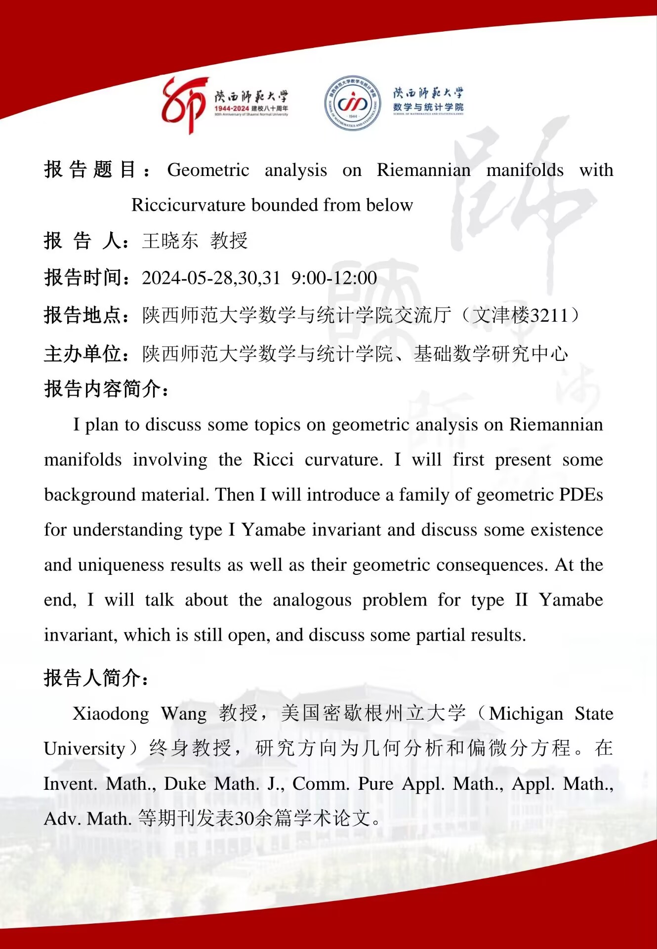 八秩同辉校庆系列46 Geometric analysis on Riemannian manifolds with Riccicuryature bounded from below