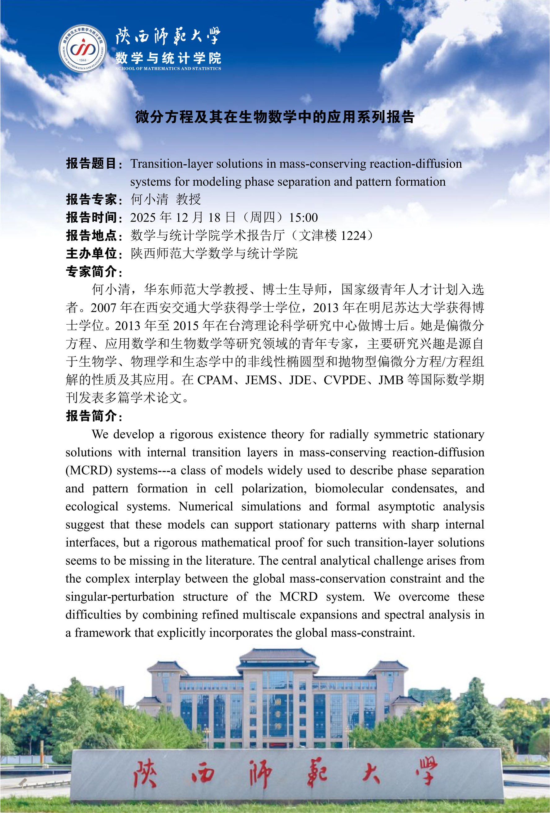 数统华章2025系列65 Transition-layer solutions in mass-conserving reaction-diffusion systems for modeling phase separation and pattern formation