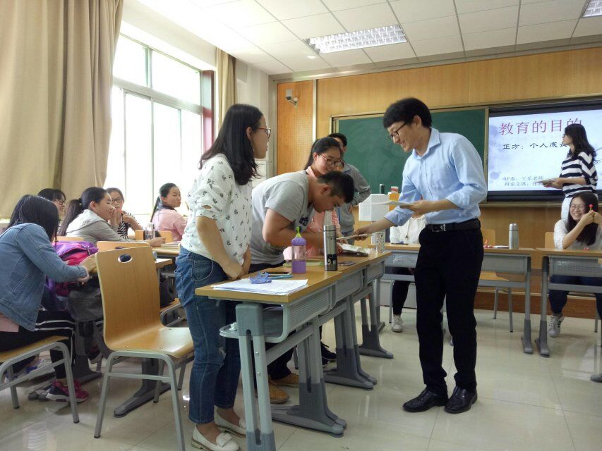 王乐老师担任此次辩论赛评委。在《中学教育学基础》课上,王老师为引导同学们追溯教育本源,并提高同学们的逻辑思维能力,策划了此次辩论赛。