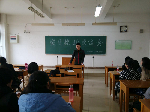 为了解决即将步入社会、踏上讲台的大三免费师范生对实习及就业择业的疑问,2013级数学与应用数学1班于3月16日下午在文津楼一段404教室举办了实习就业经验交流会。2012级的曾祥福学长、刘文贵学长、白霞学姐、王亚茹学姐、衣军潼学姐、武亚茹学姐应邀出席了本次交流会,并结合自身经历作了发言,交流会由班长杜永超主持。
