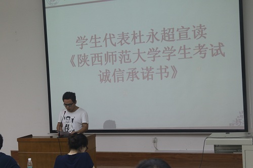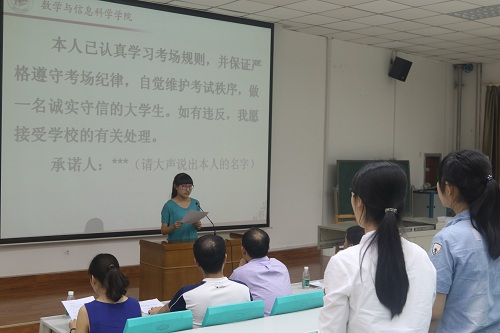 大会第三项,由2013级数学与应用数学一班杜永超、2014级数学与应用数学二班梁天娇作为员工代表宣读《365英国上市公司官网员工考试诚信承诺书》,并带领同学们进行诚信考试宣誓,号召同学们在考试中恪守诚信,严于自律。