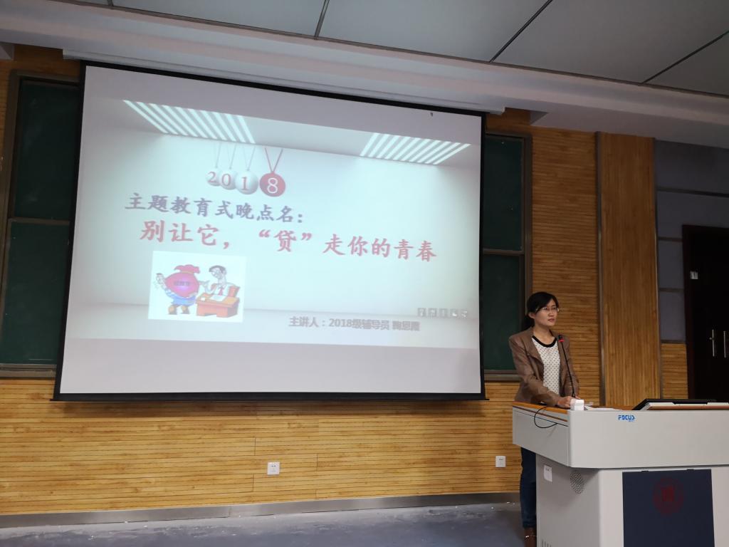 正值双十一打折促销到来之际,伴随着电商平台提供信贷业务等巨大诱惑前,很多老员工难以抵御,容易出现非理性超前消费,从而误入校园贷歧途。为避免大一新生因非理性消费而误入校园贷陷阱,10月28日晚7时,2018级新生校园贷防范主题教育活动在教学五楼5101顺利举行。2018级辅导员鞠恩霞以及2018级全体本科新生参加了活动。活动由鞠恩霞主讲。