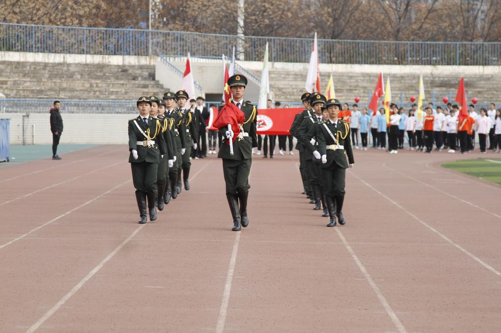 伴随着激昂的运动会进行曲,首先入场的是国旗护卫队方阵,他们紧握着神圣的国旗,目光坚毅,步伐整齐划一。