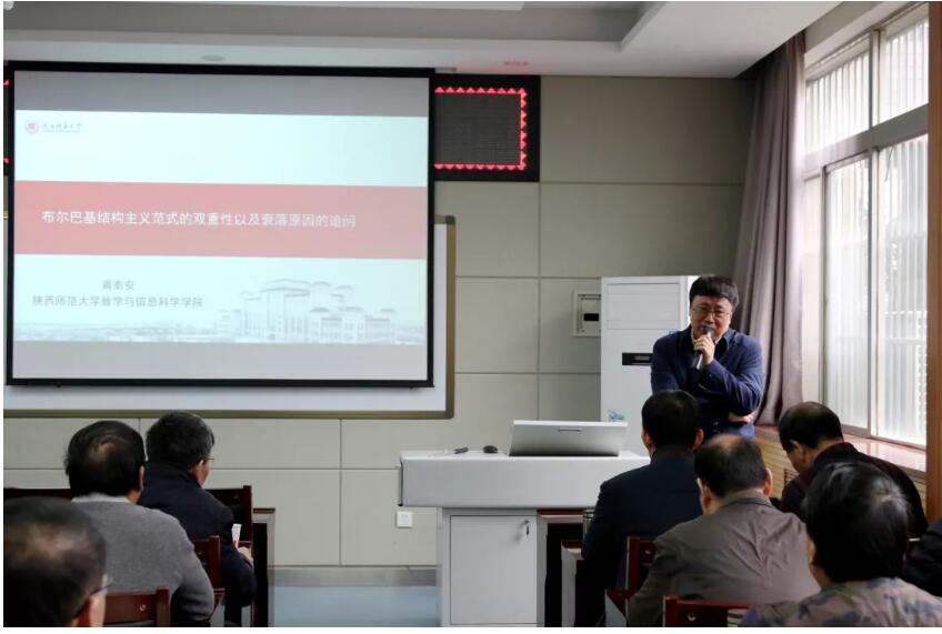 第二阶段报告会由魏广生教授主持,曹怀信教授与黄秦安教授作学术报告。曹怀信教授作了“双子相伴十年行”的主题报告,报告中他首先介绍了近年来项目组的研究成果。近年来,公司项目组成员从数学的角度,对量子信息科学研究中遇到的重要理论问题,进行了一系列探讨,同时为促进公司量子信息与量子计算机理论的研究,项目组举办了研讨会,与国内专家学者进行了交流。最后曹怀信教授介绍了个人国家基金等目前所进行的研究工作。黄秦安教授以“布尔巴基结构主义范式的双重性以及衰落原因的追问”为题,对数学教育方向以及布尔巴基学派做了详细的介绍,最后针对数学哲学与数学文化问题答疑解惑,对公司进行相关方向研究的青年教师给予热情指导和帮助。